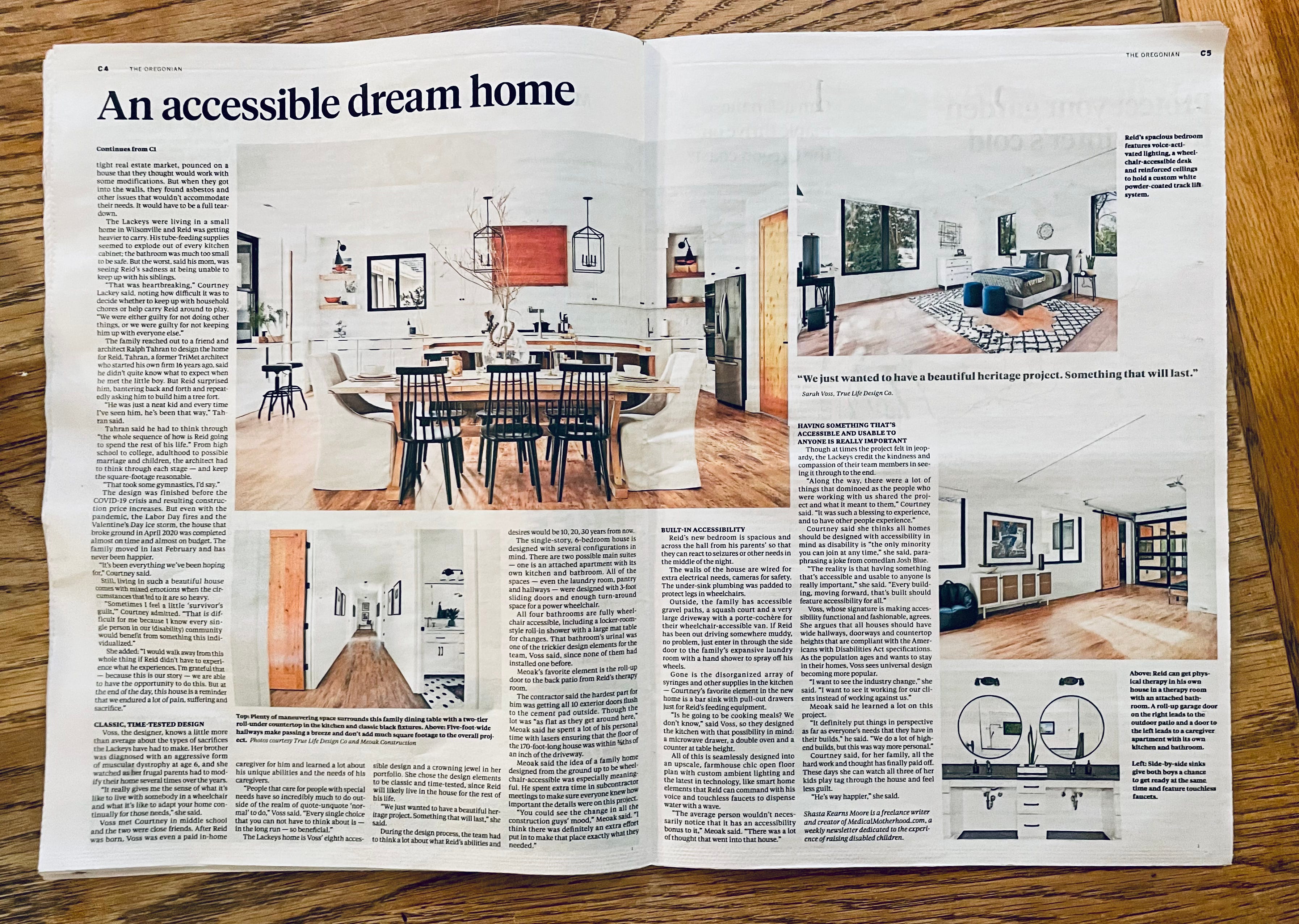 Last week (yesterday in print and last Monday online), The Oregonian/OregonLive’s Homes & Gardens section published this piece and this sidebar on a remarkable home built from the ground up to be fully accessible and last a lifetime. I am so grateful to the owners, Courtney and Brad Lackey, for letting me tell the story of the build for their 8-year-old son, Reid, and for inviting readers to see their home virtually.