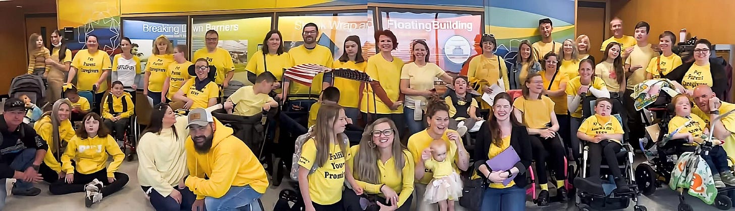 We rolled out 50-plus people deep to the Oregon State Capitol on Tuesday to advocate for the passage of Tensy’s Law, SB 538. It was awesome to see so many folks in eye-catching yellow, the color of developmental disabilities services.