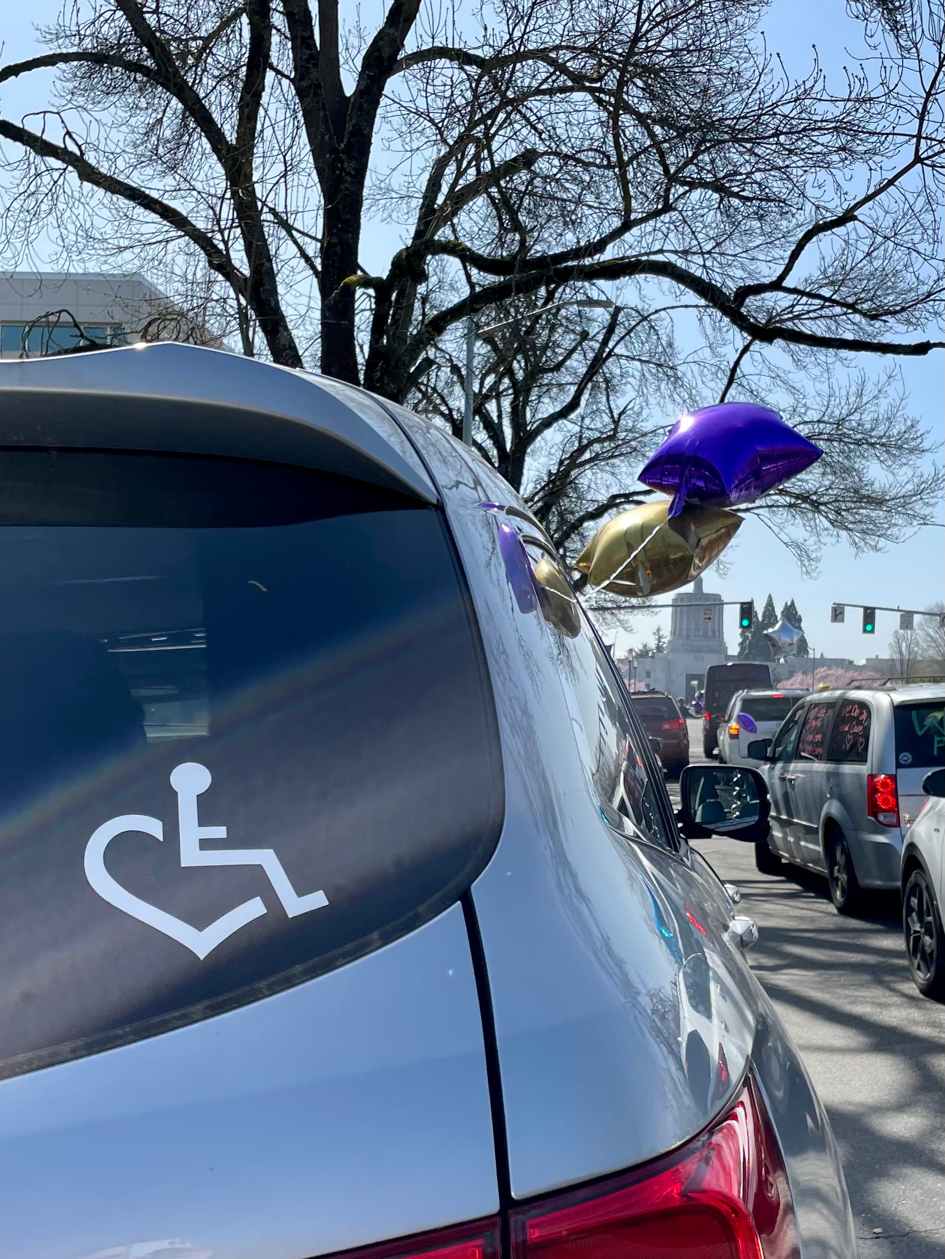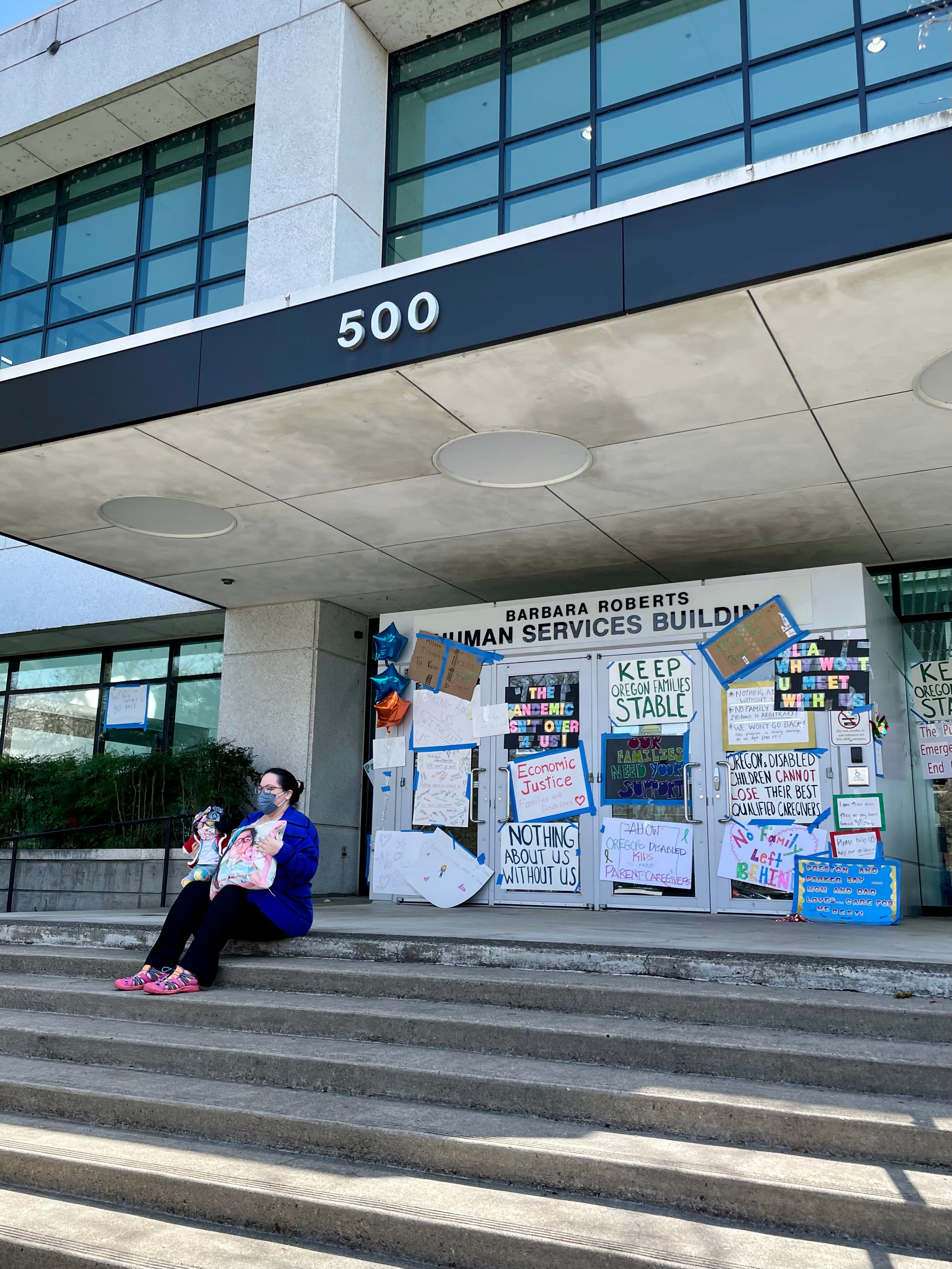 So, I bore witness as families of disabled children caravanned around the Capitol, honking and shouting, and ended at the Barbara Roberts Human Services building, home to the Department of Human Services and ODDS. With balloons and signs — which they then taped to the building’s front doors — 24 cars full of people asked their voices to be heard. Families say the temporary allowance for parent-caregivers has improved their children’s health and stability in dramatic ways.