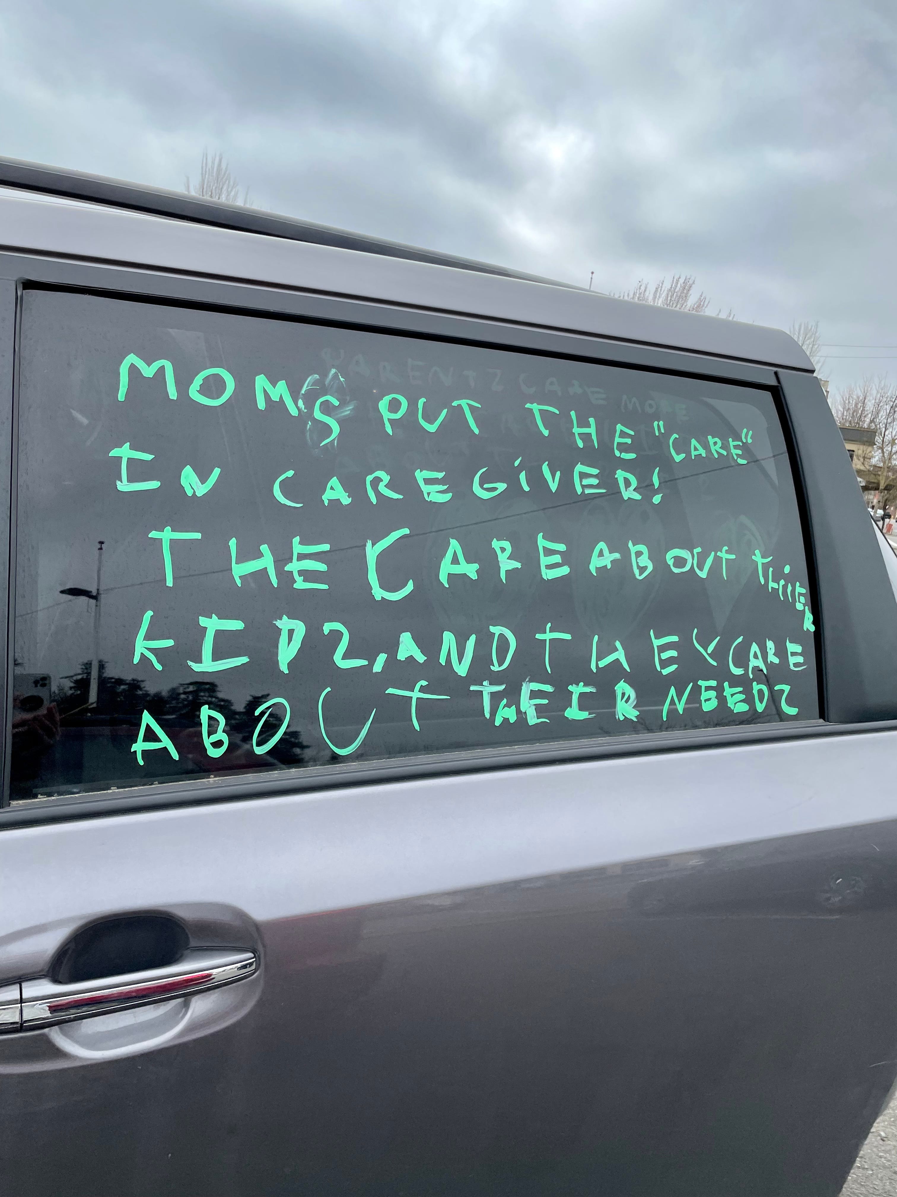 Jasper* skipped my list entirely. He drew a house with a mother and baby and wrote: “Do it for them.” Then, he wrote in bold letters on the side of the car: “Moms put the ‘care’ in caregiver! They care about their kids and they care about their needs.”