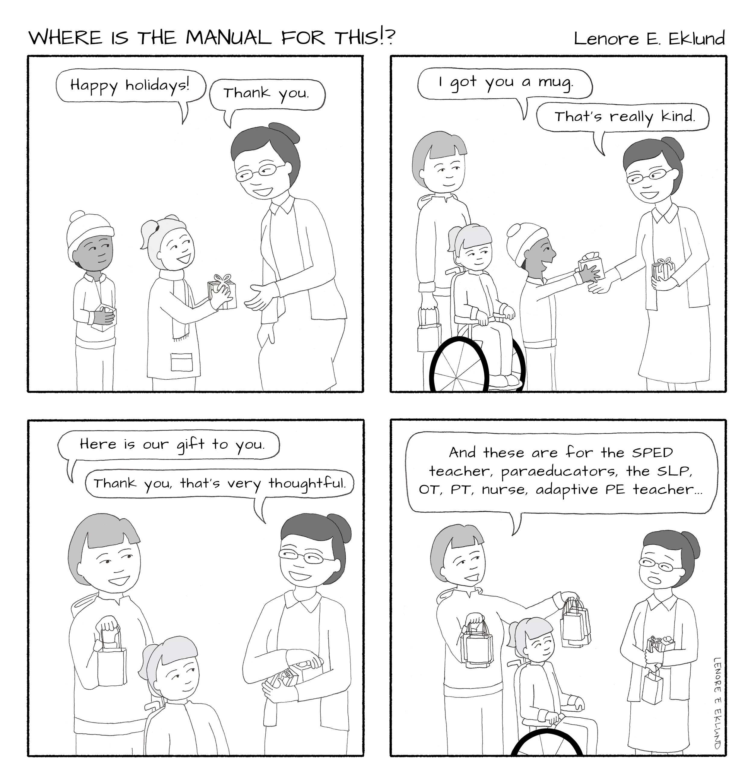 My personal philosophy is to give them a good treat at Winter Break (this year: a paper coffee cup filled with spritz cookies and a coffee gift card) and then give myself permission to ignore all the teacher, paraeducator, school nurse and other “appreciation weeks” throughout the year. Sorry, but I only have so much bandwidth!